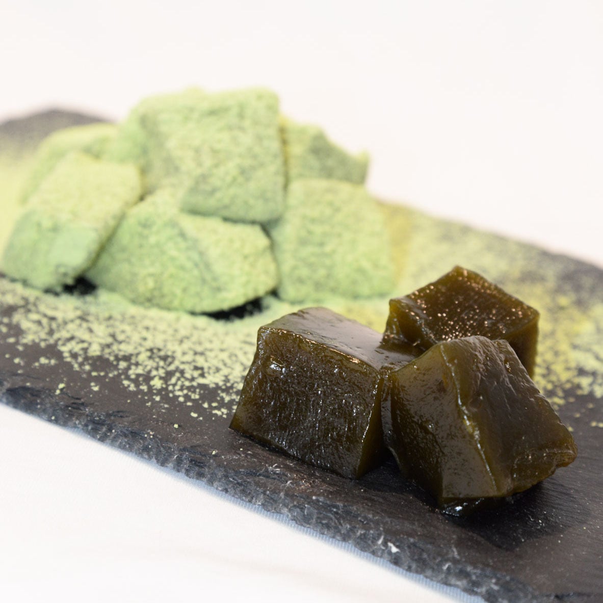 ほんのり苦味のある抹茶わらび餅に、甘くて香ばしい黒蜜をかけて楽しむ和スイーツです。