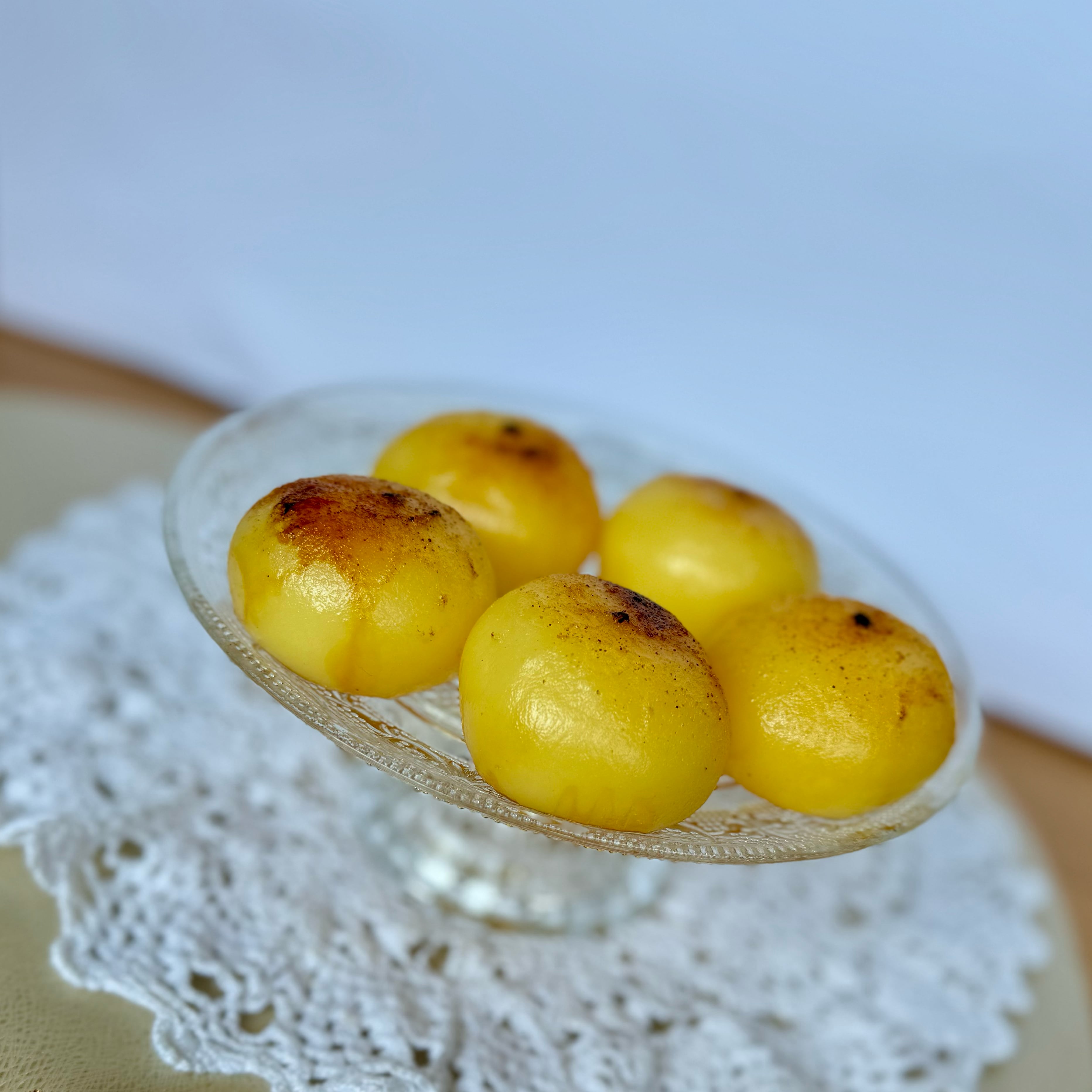 なめらかなカスタードをやわらかなお餅で包み、表面に香ばしいカラメルを焼き付けたもちもちプリンです。とろける甘さと香ばしさが織りなす上品な味わいです。